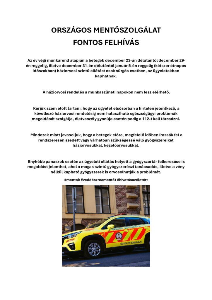 Betegtájékoztató az ünnepek idején elérhető Orvosi Ügyeleti rendről