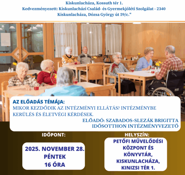 TOP_PLUSZ-3.1.3-23-PT1-2024-00019Címe: Helyi Humán Fejlesztések Kiskunlacházán – DEMENCIA ELŐADÁSSOROZAT Tovább olvasom » 2025.11.24.