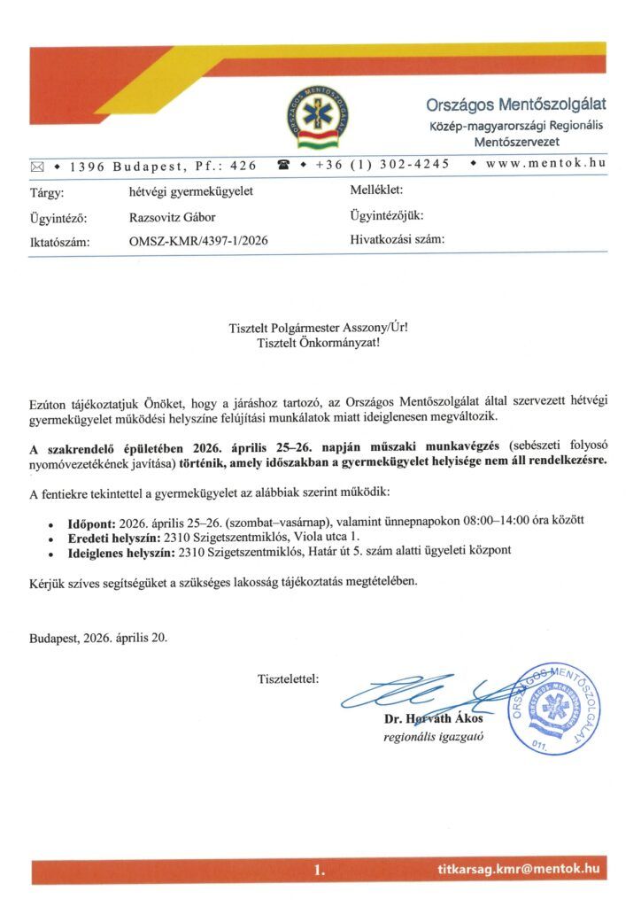 Tájékoztató hétvégi gyermekügyelet ideiglenes helyszínváltozásáról a 2026. 04. 25-26 napokon